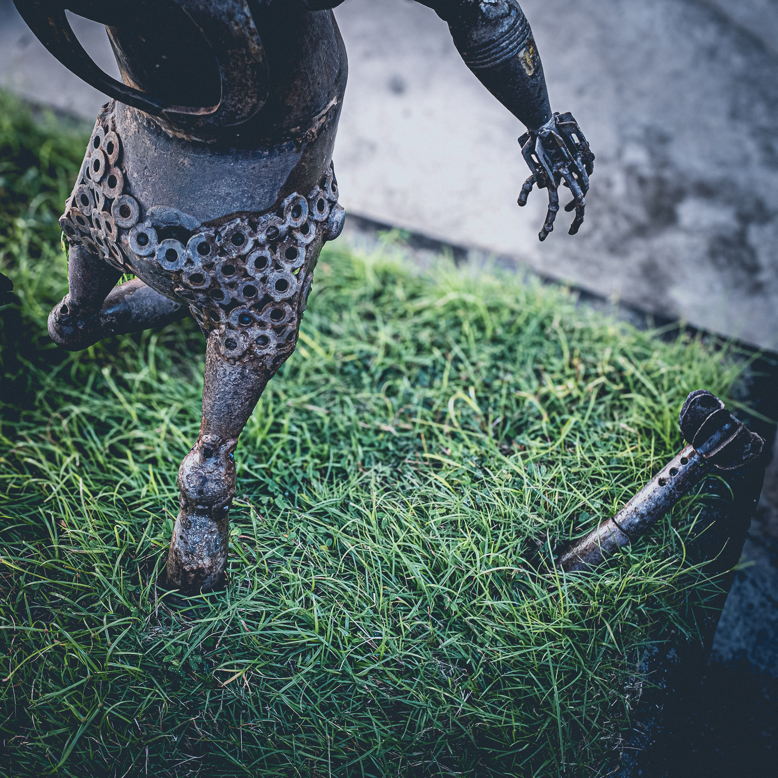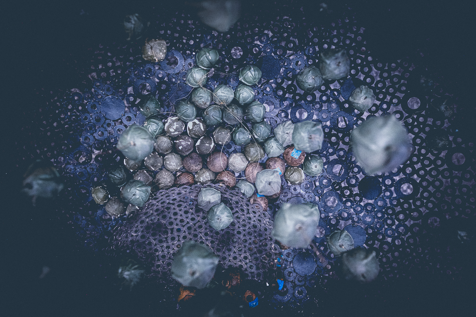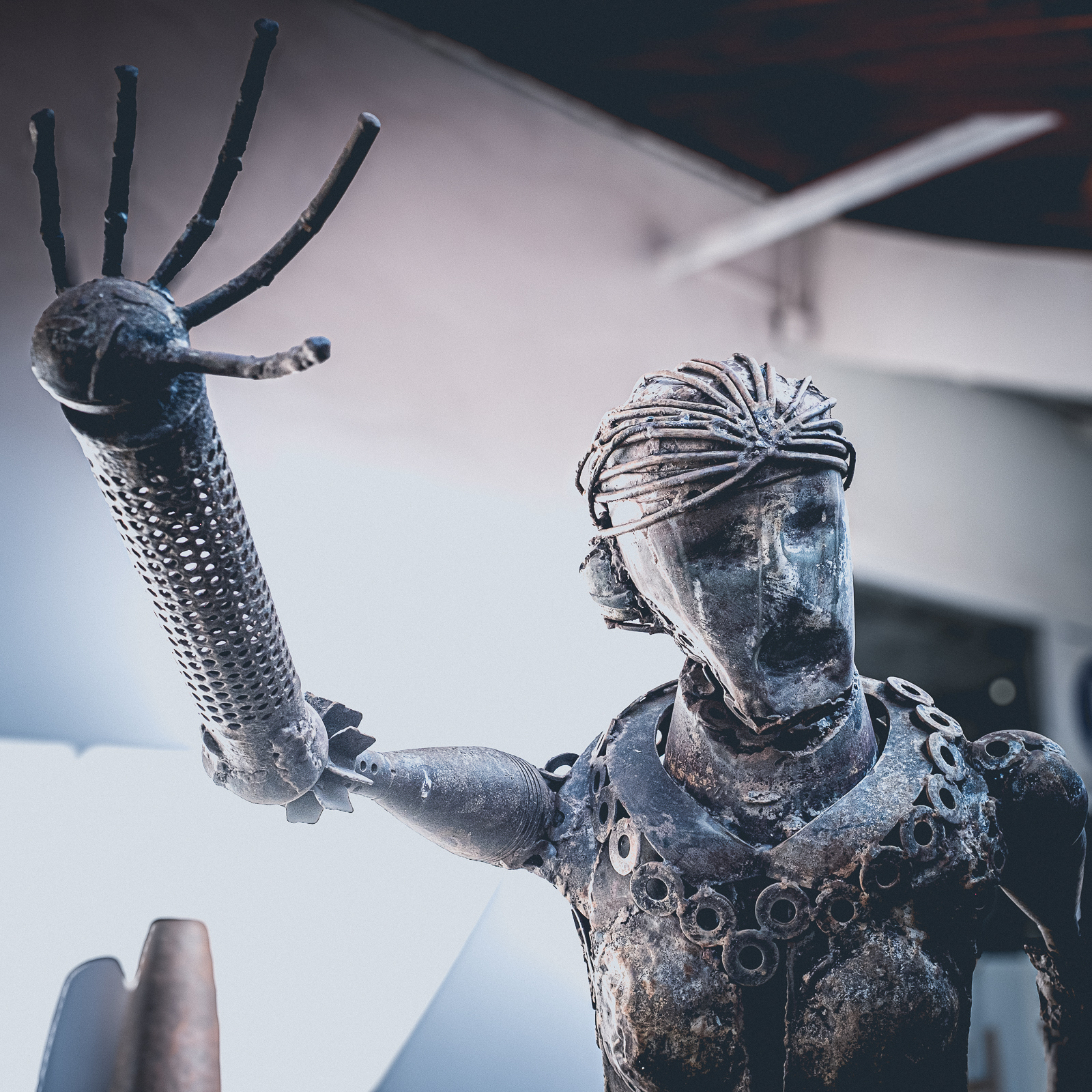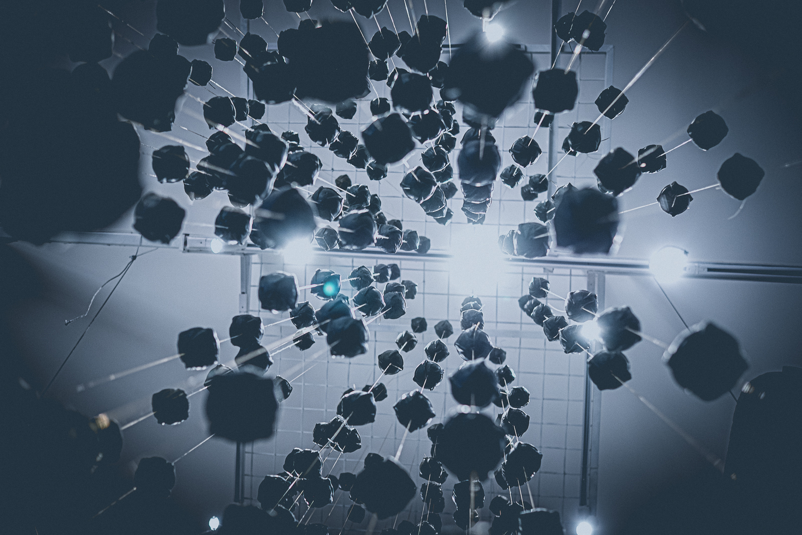Handmade prosthetics, shaping a reality that is heavy, but still tries to stand. Cluster bombs, suspended, multiplied, almost forming an artificial sky. This is not the spectacle of horror: it is the hardest idea to digest—normalisation. Ordnance designed to open and scatter. A technical gesture, serial, anonymous. A geometry that, once it stays underground, becomes destiny. And then you understand that post-war here means something else: not an “after”, but a “during” that has already lasted for decades.